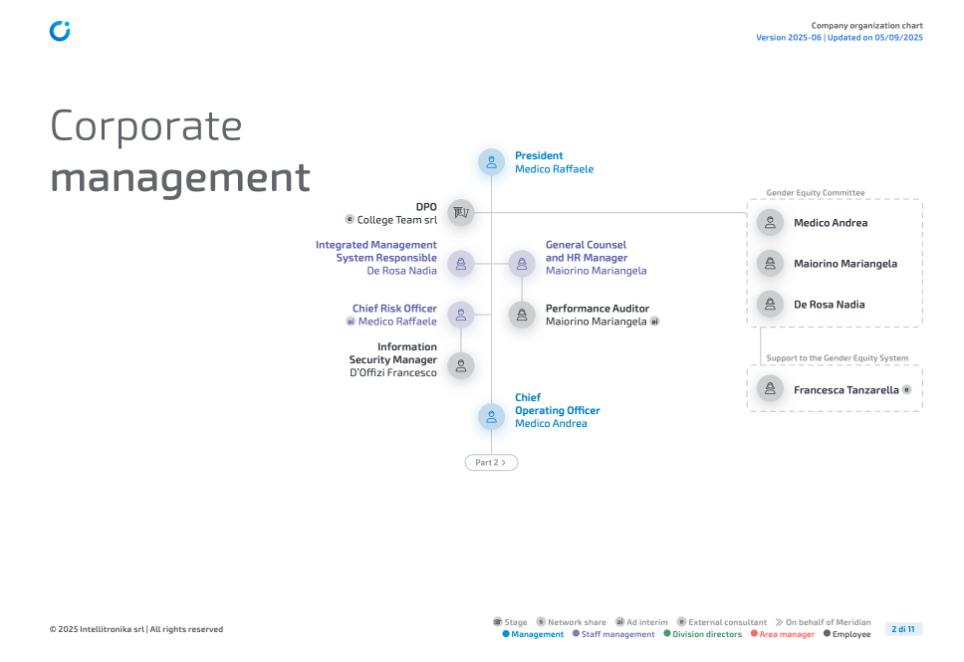 - Approval: verification of the document’s compliance with the policy for the prevention of predicate offenses governed by Legislative Decree no. 231/2001 (which authorizes its dissemination), carried out by the Board of Directors/Sole Director.